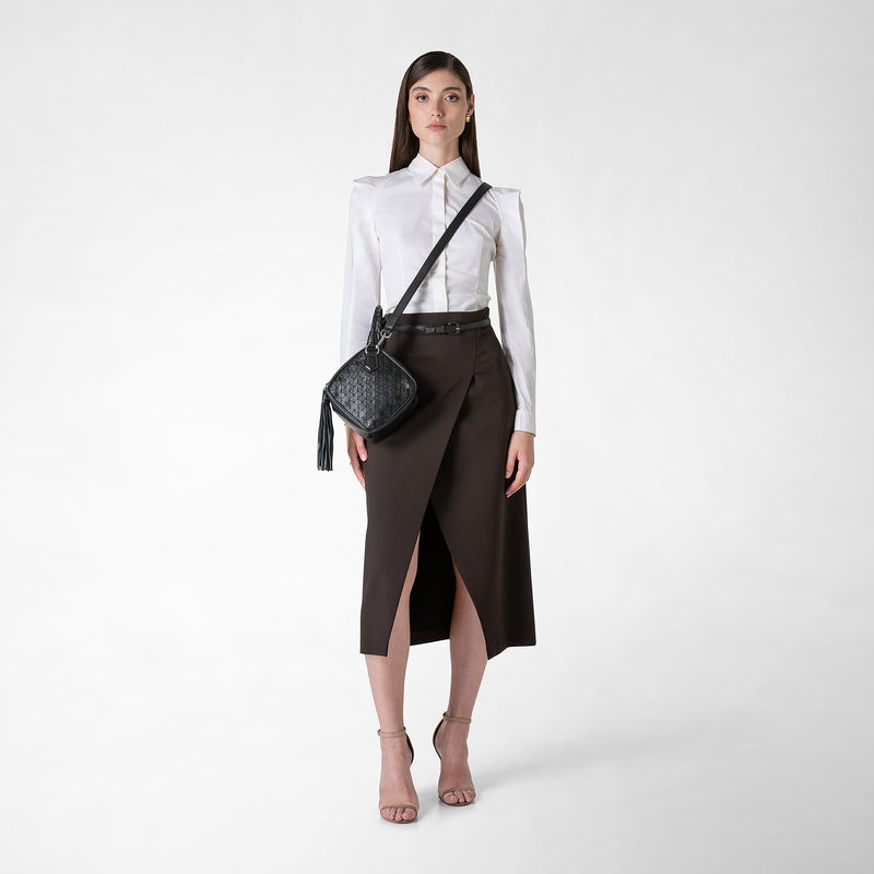 The geometric silhouette of the Petra handbag in Black Mosaico nappa leather is modern and elegant. It is a refined accessory for every occasion and it is the perfect size to keep things light and store your small everyday essentials. Its graphic and eye-catching pattern is the result of an exclusive hand weaving process that dates back to 1947, a true emblem of the artisanal craftsmanship of the Maison and of Made in Italy tradition.