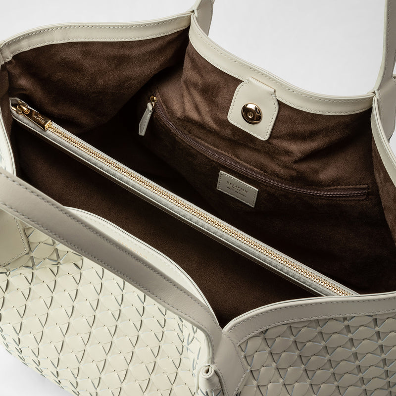 The Secret Tote Bag in Off-White Mosaico nappa leather boasts soft lines. A lightweight, roomy everyday tote for women seeking practical elegance, the Secret Tote Bag is an all-rounder with plenty of inner pockets and compartments. This bag is made of Mosaico leather, which uses an exclusive weaving process dating back to 1947, a true emblem of Serapian craftsmanship and Made in Italy tradition.