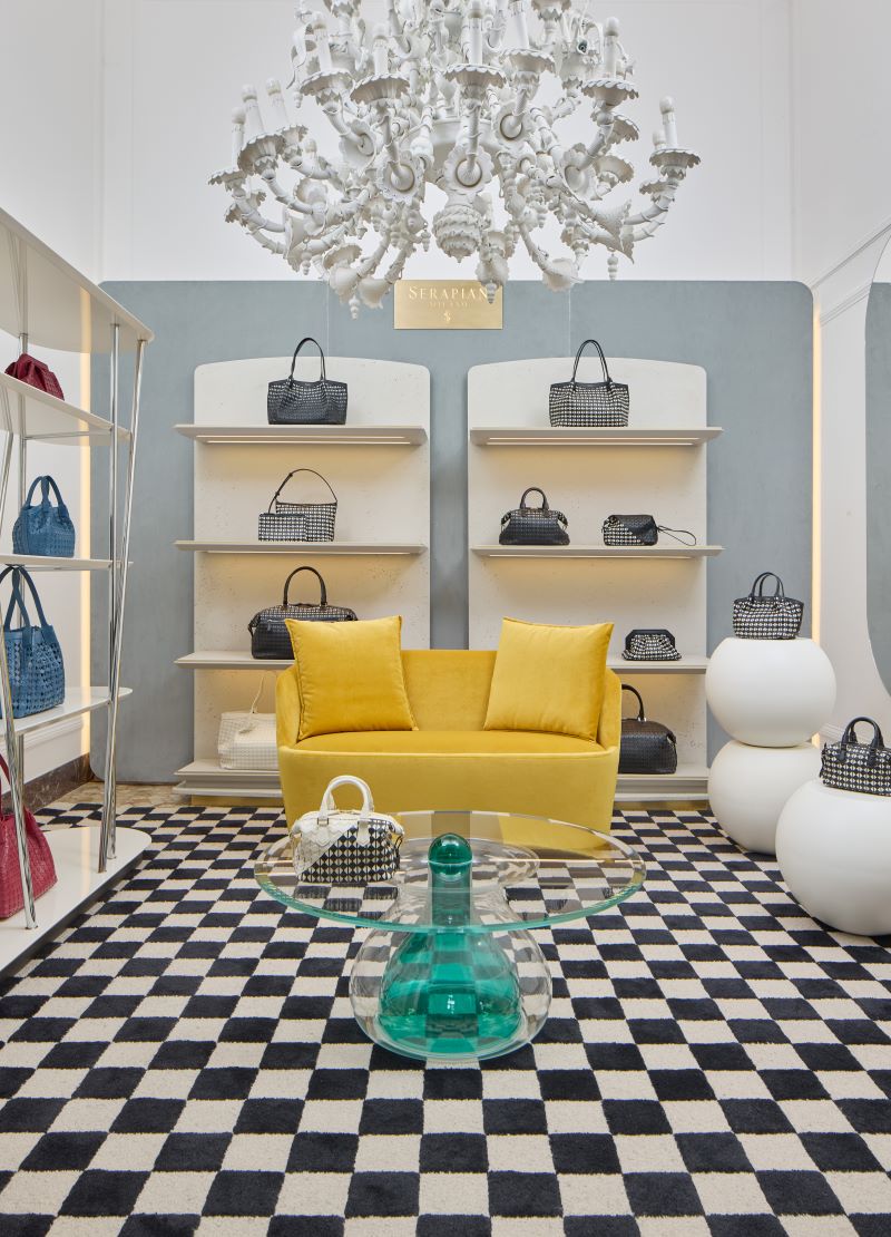 As part of the Fuorisalone presentation, Serapian also stages an exhibition on the first floor of Villa Mozart, with an installation created in collaboration with Cappellini to showcase a dialogue between design and high craftsmanship. Contemporary Cappellini pieces, including Dimorestudio’s Millepiedi bookcase and Elena Salmistraro’s Myia glass coffee table, help showcase some of Serapian’s most distinctive Mestieri D’Arte.