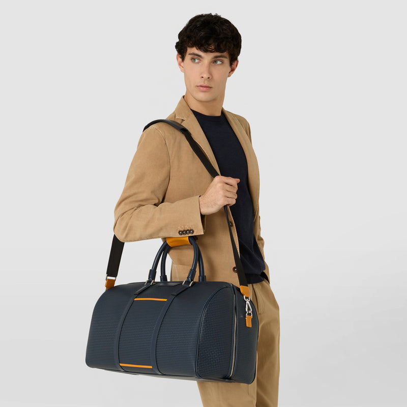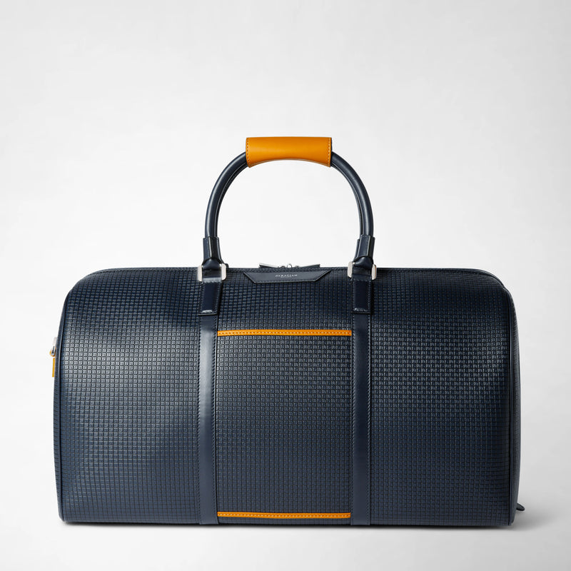 The holdall in Ocean Blue Stepan coated canvas and Sunrise colored leather is a stylish work-into-weekend option. Compact yet spacious enough to fit all your essentials, it features a zip-around closure and inner compartments. Created to stand the test of time, it is made from Stepan coated canvas, a sturdy and water-resistant material with an all-over S-etching detail. Originating from the far-sighted vision of Ardavast Serapian, Stepan was first trademarked in the mid-seventies and remains an exclusive house emblem.
