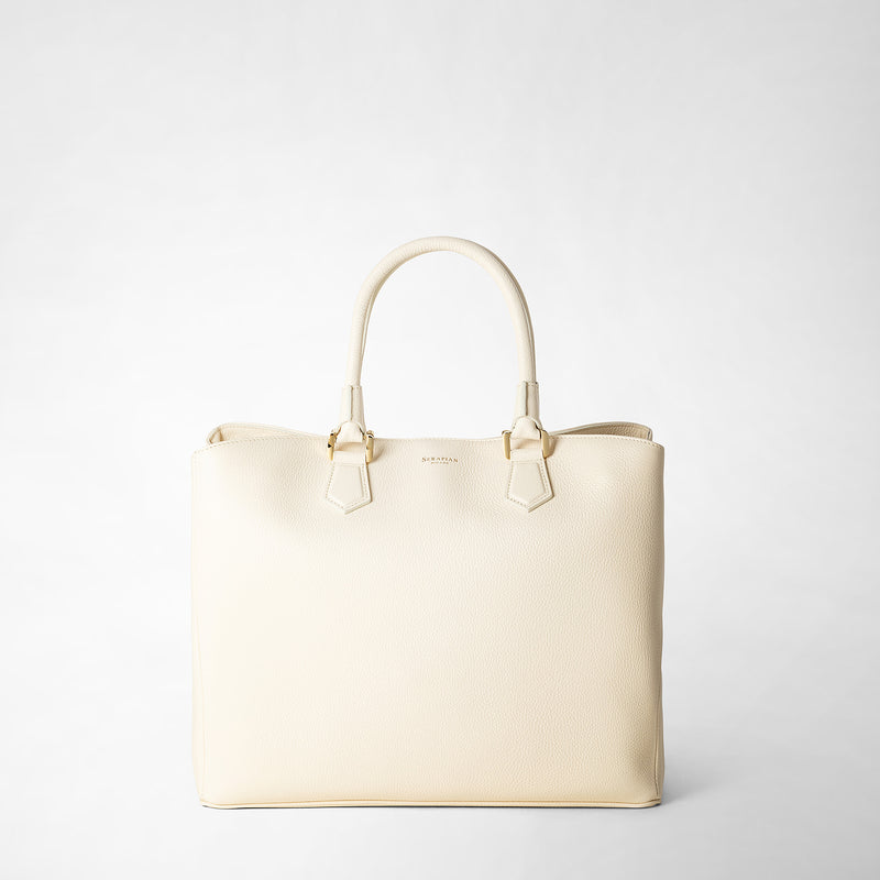 The elegant, delicately curved Luna handbag in precious and Cream Rugiada leather with inserts in Mosaico blends style and substance. It's a versatile, spacious and practical carry-all that adapts to work-into-weekend agendas. With its fine-grained texture, as smooth as clusters of small dewdrops, the Rugiada leather elevates the unique attributes of the Luna Handbag.