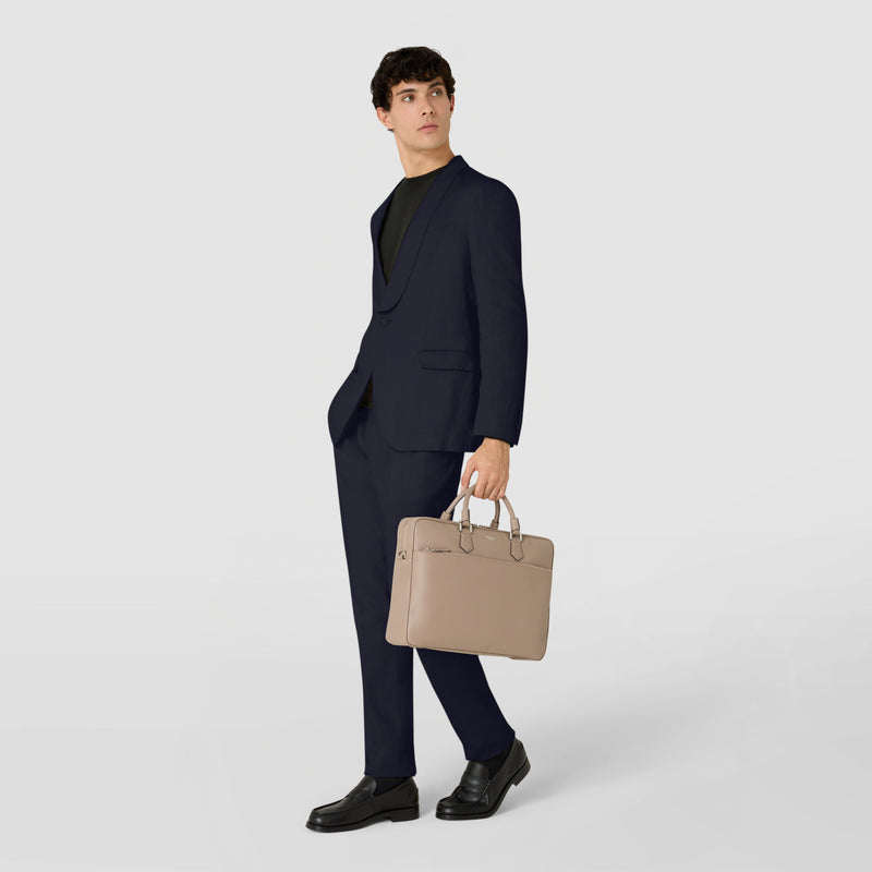 It's easy to make an impression with the modern and sophisticated Slim Briefcase in Sahara Cachemire leather, an exclusive, naturally tumbled calfskin leather that is as smooth and soft as the finest cachemire. The perfect travel companion, this compact design with outer pocket can be used as a briefcase or laptop bag. Meticulously crafted in Italy by expert artisans.