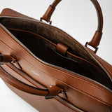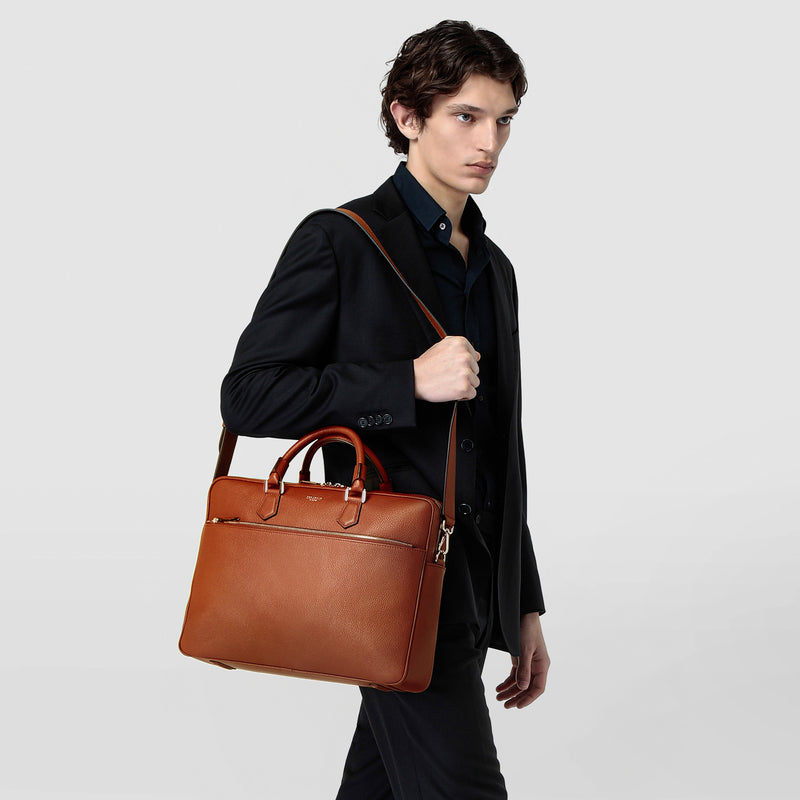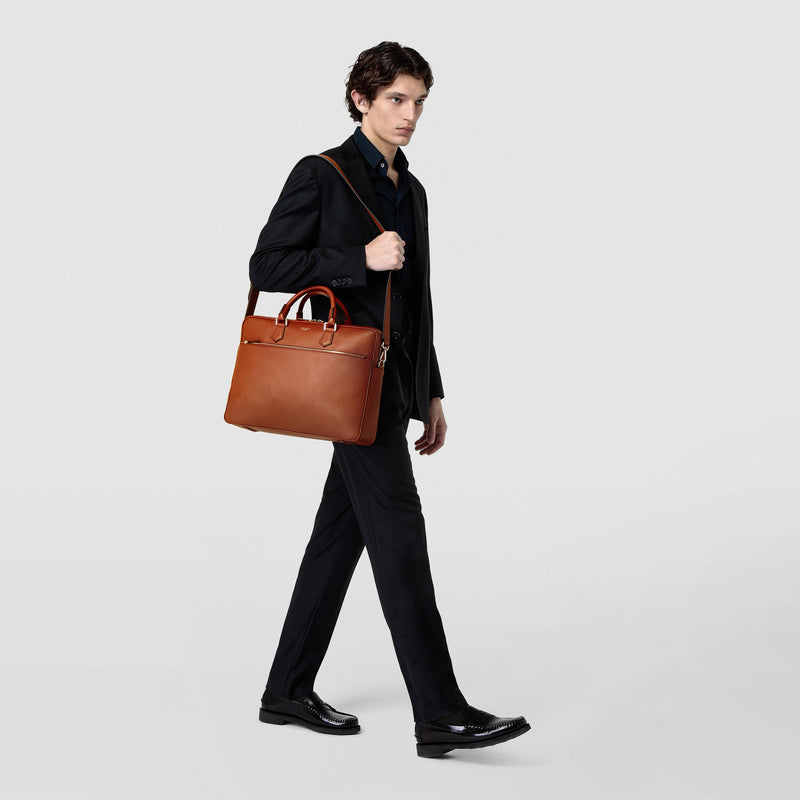 It's easy to make an impression with the modern and sophisticated Slim Briefcase in Tobacco Cachemire leather, an exclusive, naturally tumbled calfskin leather that is as smooth and soft as the finest cachemire. The perfect travel companion, this compact design with outer pocket can be used as a briefcase or laptop bag. Meticulously crafted in Italy by expert artisans.
