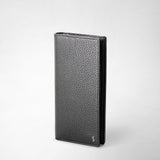 View photo: Vista di dettaglio angolare del PORTAFOGLIO ALLUNGATO IN PELLE CACHEMIRE che mostra la texture in pelle nera bottalata e il logo metallico Serapian.