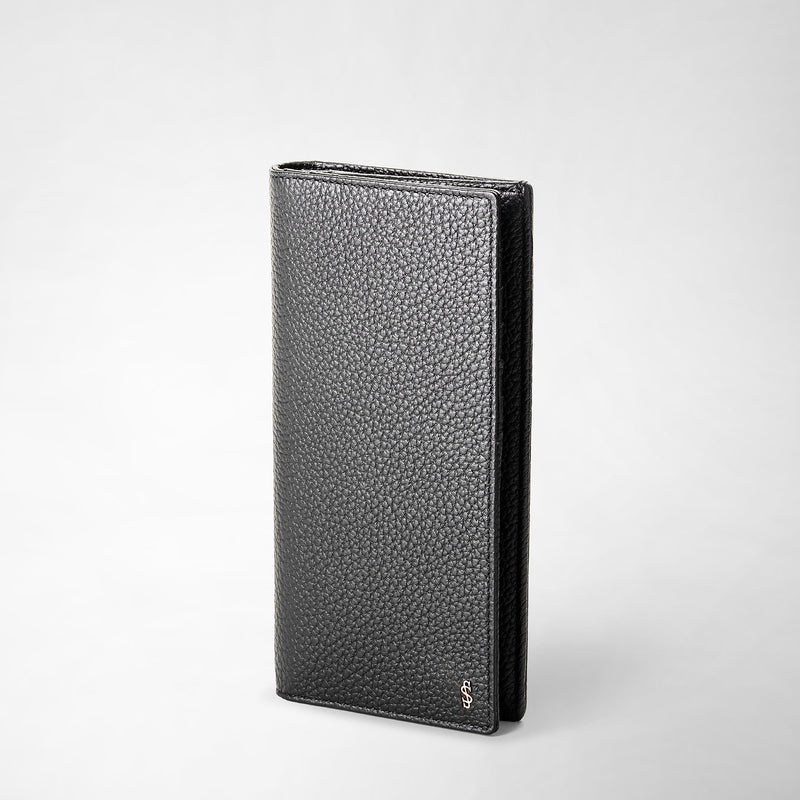 View photo: Vista frontale del PORTAFOGLIO VERTICALE IN PELLE CACHEMIRE. Portafoglio nero in pelle bottalata con piccolo logo metallico nell’angolo inferiore destro, su sfondo chiaro.