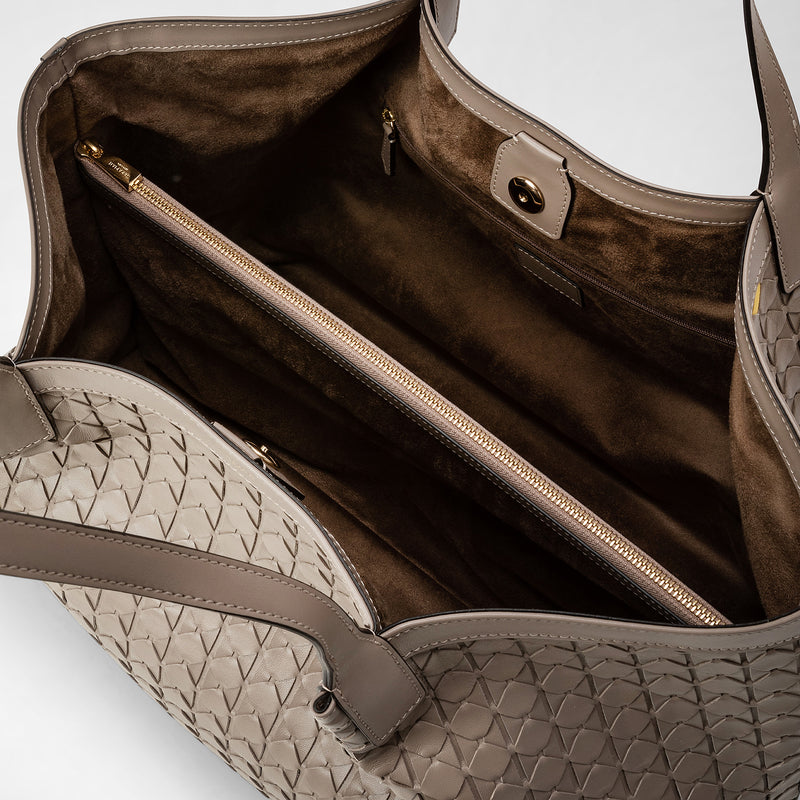 View photo: Vista laterale della TOTE BAG SECRET IN MOSAICO: borsa in pelle nappa Mosaico Sahara color beige, con manici lunghi doppi e texture intrecciata iconica.