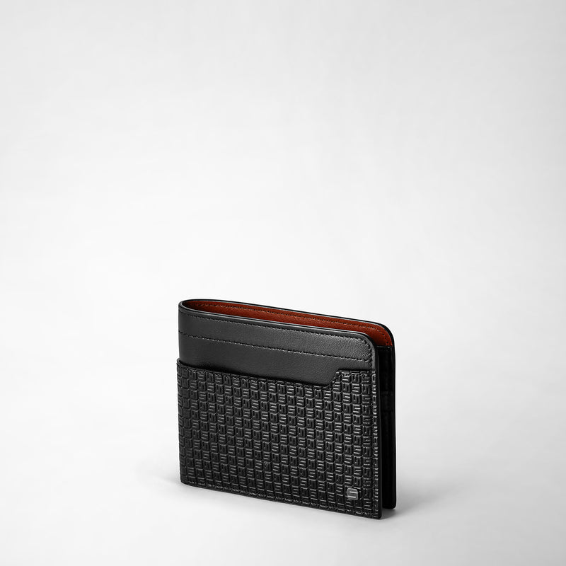 View photo: Frontal angle shows the 6-CARD BILLFOLD WALLET IN STEPAN with black Stepan canvas, Cuoio leather accents, and finely textured surface.