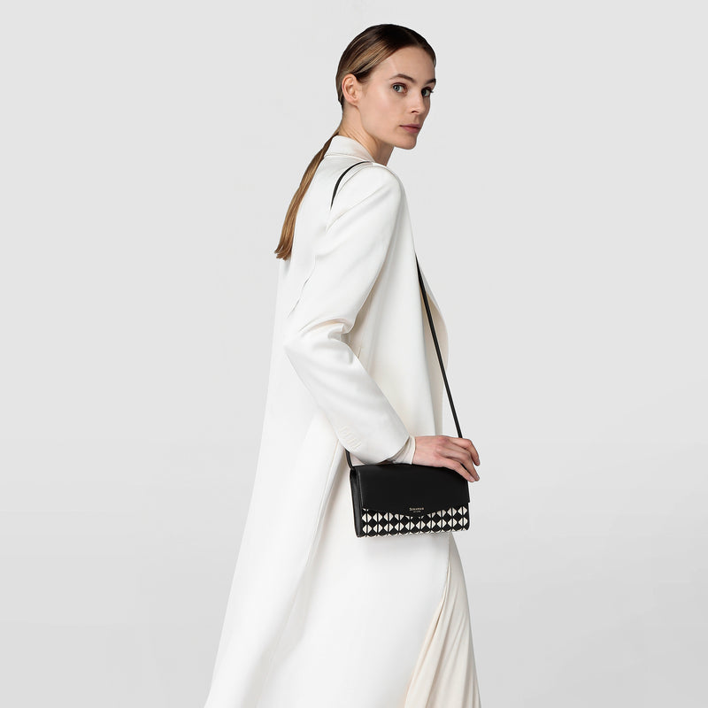 View photo: Front view of a woman in a long white coat holding a CLUTCH WITH SHOULDER STRAP IN MOSAICO in black and cream Mosaico leather in her right hand.