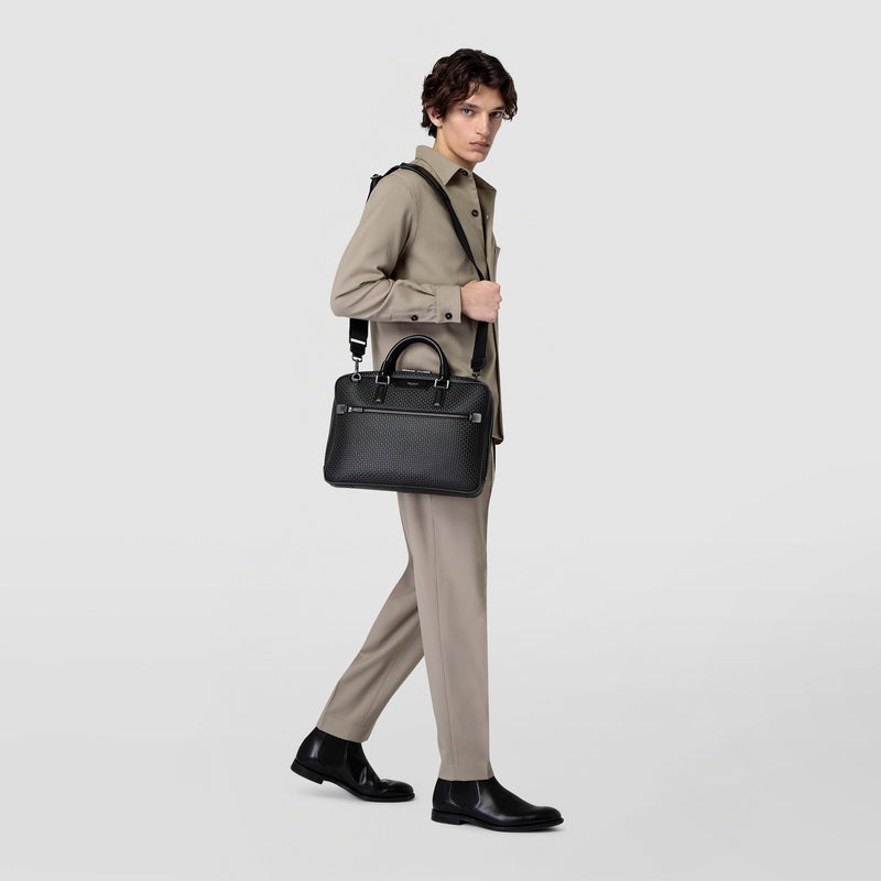 View photo: Three-quarter view: EXTRA SLIM BRIEFCASE IN STEPAN displays a slim, black briefcase with a textured pattern, leather handles, and a front zip pocket. ‘SERAPIAN MILANO’ is visible on a metal plate.