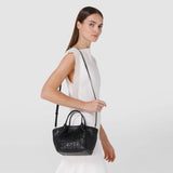 View photo: Front view of a woman carrying the MINI SECRET BAG IN MOSAICO AND ELAPHE made of black woven Mosaico leather on her arm and as a crossbody.