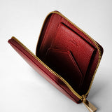 View photo: Detail view: MINI ZIP AROUND WALLET IN RUGIADA LEATHER shows a burgundy fine-grained leather wallet with a gold zipper, open to display card slots and compartments.