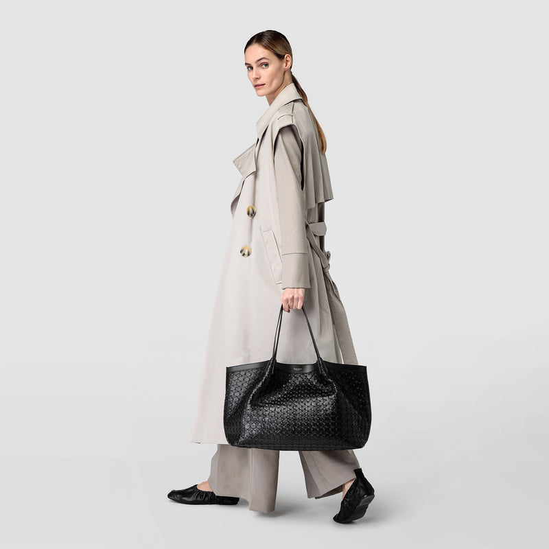 The Secret Tote Bag in Black Mosaico nappa leather boasts soft lines. A lightweight, roomy everyday tote for women seeking practical elegance, the Secret Tote Bag is an all-rounder with plenty of inner pockets and compartments. This bag is made of Mosaico leather, which uses an exclusive weaving process dating back to 1947, a true emblem of Serapian craftsmanship and Made in Italy tradition.
