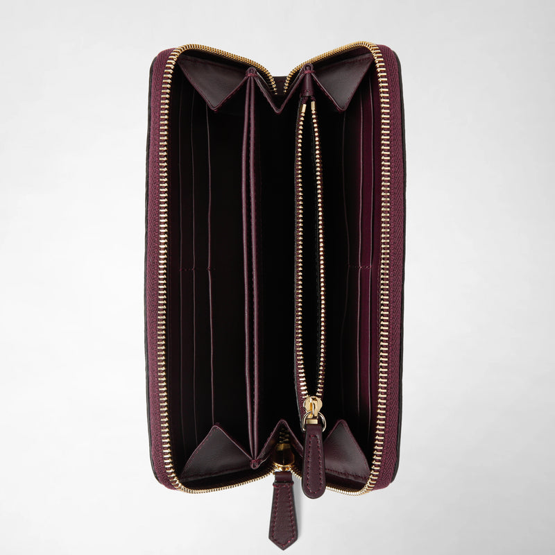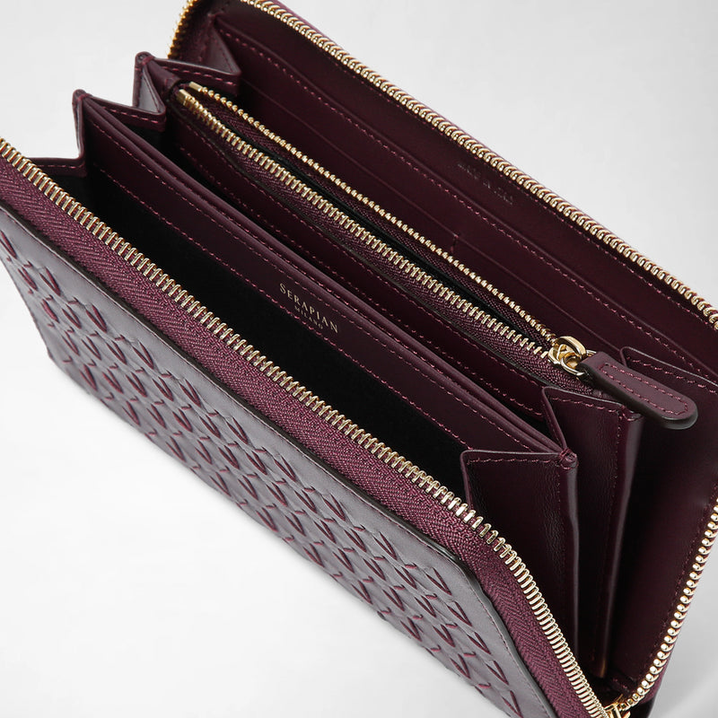 The Zip-Around Wallet in Dark Plum Mosaico nappa leather is a timeless accessory. It opens to an organised interior with 12 card slots, a note compartment and separate zipped coin pouch. This wallet is handcrafted using the signature Mosaico process, a house exclusive since 1947, by which soft nappa leather strips are woven by expert craftsmen.