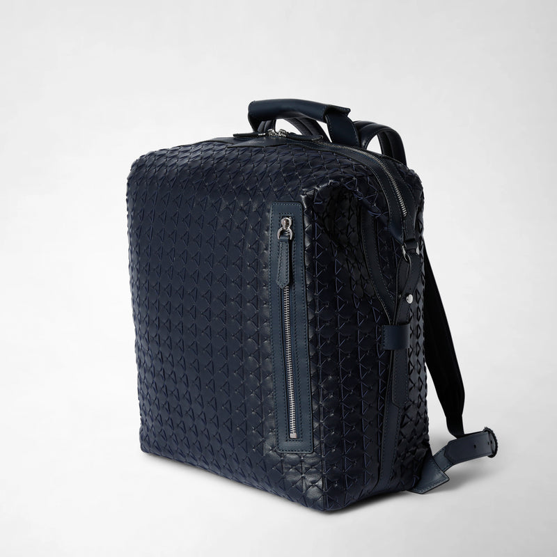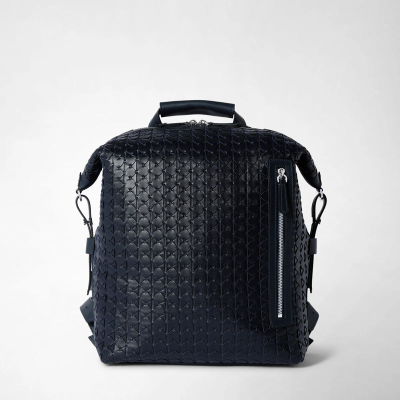 Effortlessly transition from the office to overnight trips with the elegant Backpack in Navy Blue Mosaico nappa leather. Sophisticated yet distinctly sporty, this accessory opens to reveal ample space for storing your away-from-home essentials, whether they be a work laptop or a change of clothes. Each Backpack is meticulously handcrafted with the signature Mosaico weaving process, a house exclusive since 1947. Buttery soft nappa leather strips in tonal or contrasting hues are delicately handwoven by expert craftsmen to create an eye-catching graphic pattern that is a true emblem of the Maison's virtuosity and Made in Italy tradition.