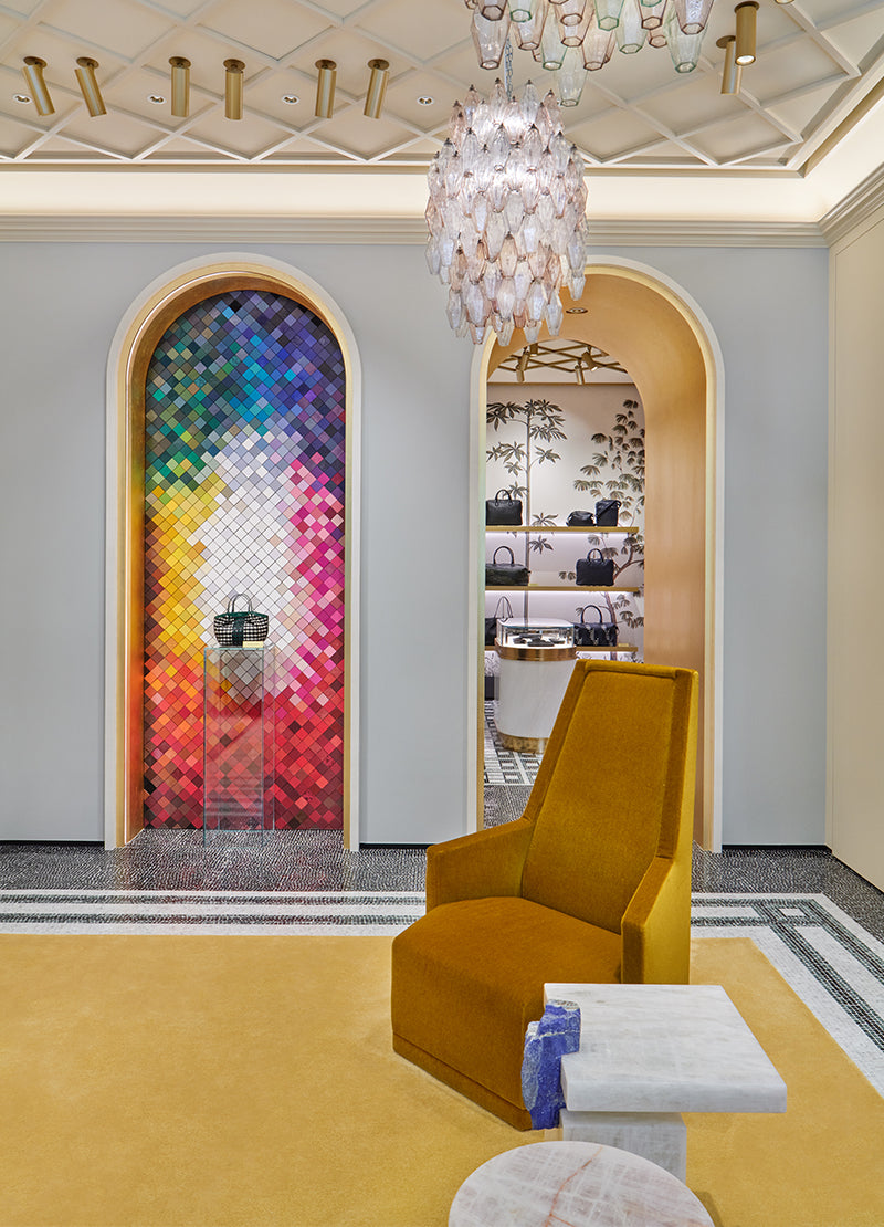 On this floor, a bespoke atelier led by a skilled craftsperson will offer guests the opportunity to create a made-to-measure Serapian piece. Clients will have the option of crafting a bespoke bag from more than 50 colours of nappa, which can be combined through the brand’s iconic Mosaico leather concept.
