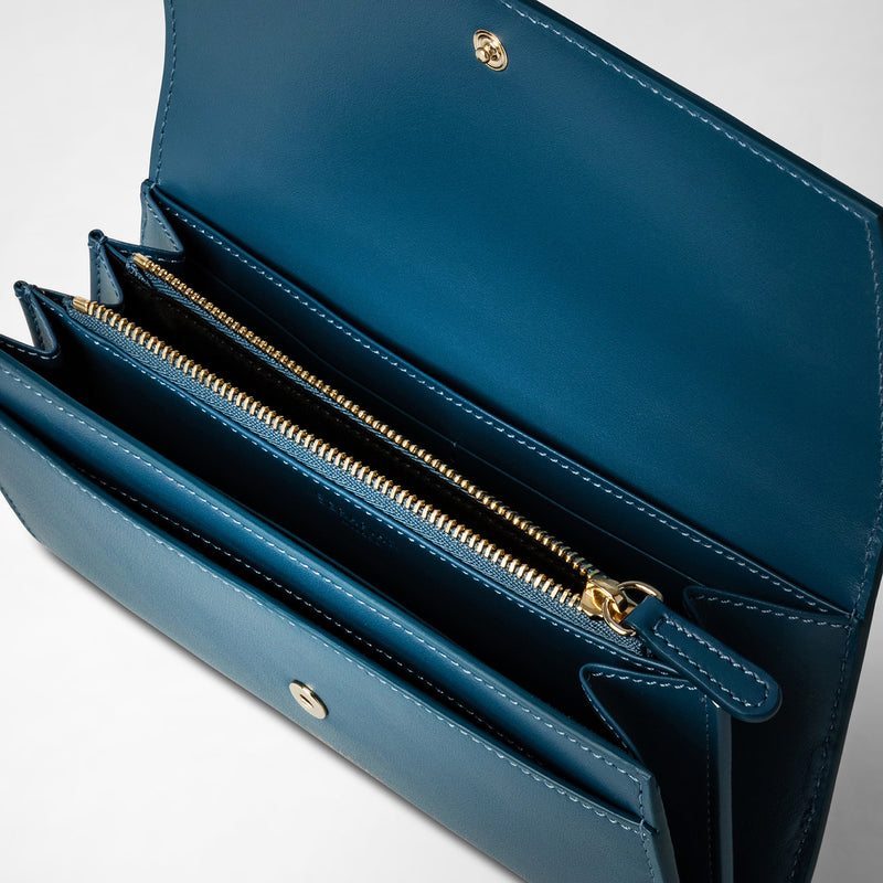 Interieur : deux compartiments et une poche zippee centrale separee. Six fentes pour cartes dans chaque compartiment, plus une poche.