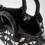 View photo: ディテールビュー:MOSAICO製ナノSECRETバッグが上から見える。ブラックとオフホワイトのモザイク柄、ゴールドの金具と持ち手が特徴的。