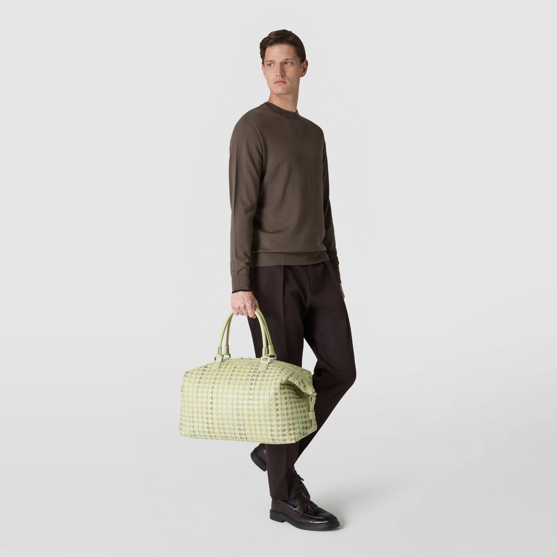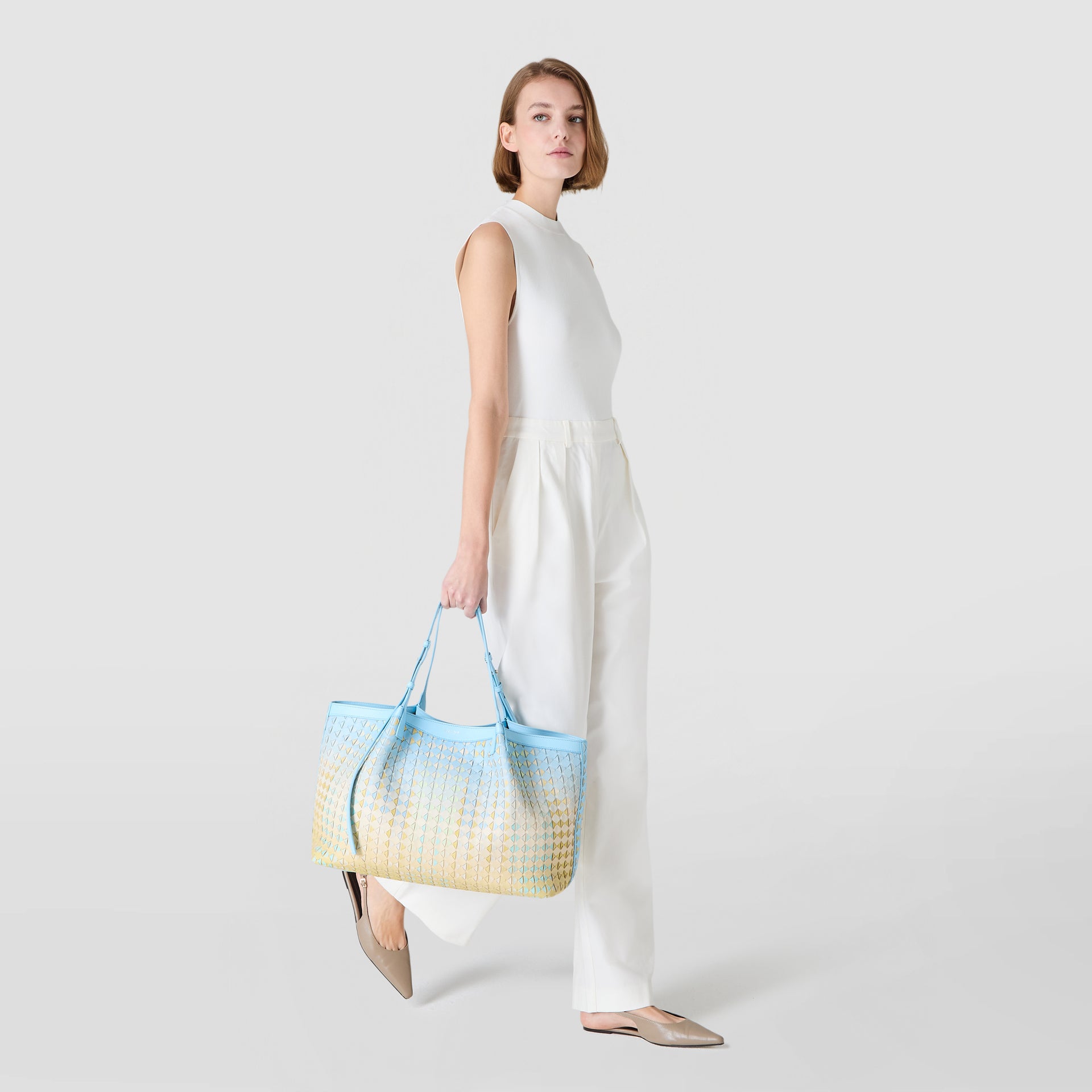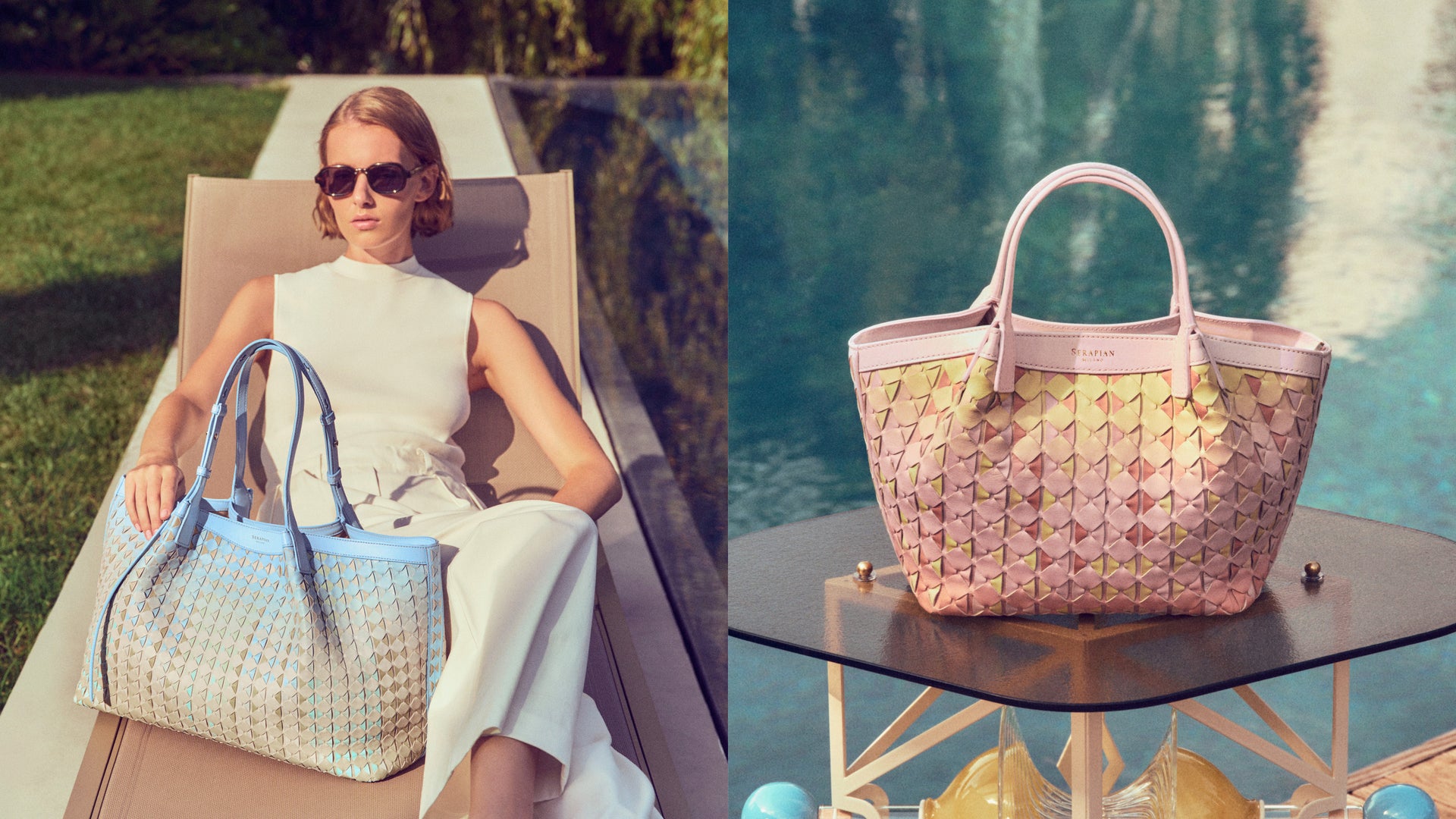 Bethan Laura Wood reimagines Serapian’s icons in a vibrant palette of Azure, Pink, Off-White, and Ice, blended into a Chiaroscuro pattern inspired by the Japanese Bokashi technique, a woodblock printing technique used to achieve gradual shading from dark to light hues. Each unique creation showcases Serapian’s Mosaico weaving, ensuring that every piece is one-of-a-kind.