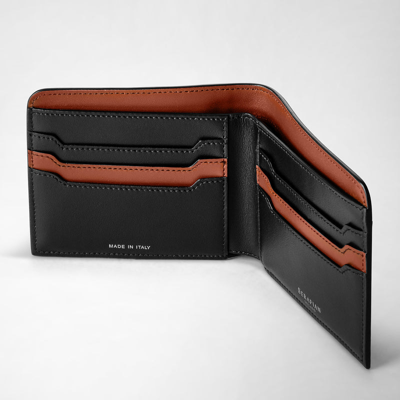View photo: Front view of the 6-Card Billfold Wallet in Stepan 72, opened, showing black and cuoio leather compartments, card slots, and embossed 'MADE IN ITALY' and 'SERAPIAN' lettering.