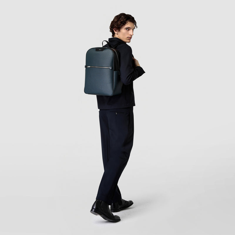 Exterior: zip fastening, front zipped pocket, small zipped pocket at the back, suitcase handle, nylon shoulder straps, mesh back. Interior: single compartment with laptop pocket, two smartphone pockets, four card pockets, pen holder, zipped pocket. Microfibre lining. Gunmetal gray finish hardware.