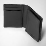View photo: Angled view: BUSINESS CARD CASE IN STEPAN in asphalt gray and eclipse black open to show multiple card slots and compartments, with embossed text 'MADE IN ITALY' and 'SERAPIAN MILANO.'