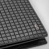 View photo: Frontal view of the BUSINESS CARD CASE IN STEPAN in Asphalt Gray and Eclipse Black Stepan, box-shaped embossing and small silver emblem in the corner.
