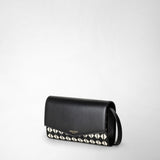 View photo: Frontal view: CLUTCH WITH SHOULDER STRAP IN MOSAICO shows a sleek rectangular clutch in black leather with off-white geometric mosaico detailing and a detachable strap. Visible text: SERAPIAN MILANO.