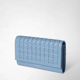 View photo: Frontal view: CONTINENTAL WALLET IN MOSAICO displays a rectangular light blue nappa leather wallet with a geometric woven pattern and gold 'SERAPIAN MILANO' lettering on the flap.
