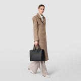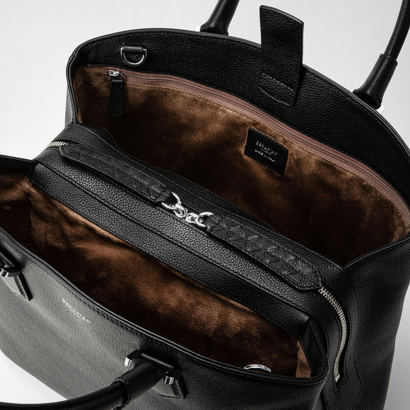 The elegant, delicately curved Luna handbag in precious and soft Black Rugiada leather with inserts in Mosaico blends style and substance. It's a versatile, spacious and practical carry-all that adapts to work-into-weekend agendas. With its fine-grained texture, as smooth as clusters of small dewdrops, the Rugiada leather elevates the unique attributes of the Luna Handbag.