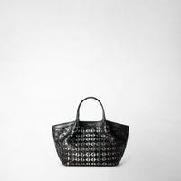 View photo: Frontal view: MINI SECRET BAG IN MOSAICO AND ELAPHE shows a small, black, woven leather handbag with two top handles, featuring an intricate texture and a shiny finish.