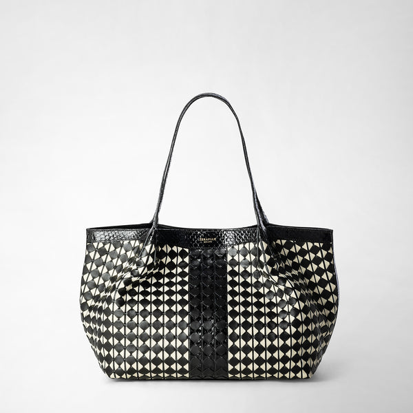 View photo: Three-quarter frontal view: MINI SECRET BAG IN MOSAICO AND ELAPHE displays a petite, black woven nappa leather handbag with double top handles on a plain background.