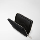 View photo: Front view of MINI ZIP AROUND WALLET IN RUGIADA LEATHER, black fine-grained leather surface with silver zipper, SERAPIAN logo visible.