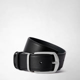 View photo: Frontal view: REVERSIBLE BELT IN CACHEMIRE LEATHER shows a black textured leather belt with a sleek silver-tone buckle engraved with 'SERAPIAN'.